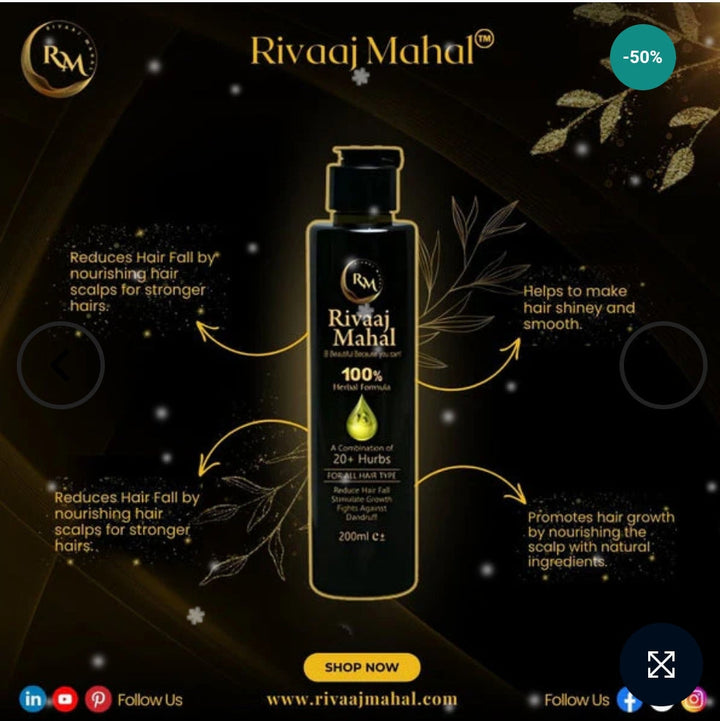 Give your hair the care it truly deserves with Rivaaj Mahal Herbal Hair Oil, expertly crafted with over 20 natural herbs like Amla, Coconut, Castor, Hibiscus, Neem, Kalonji, Reetha, and more.